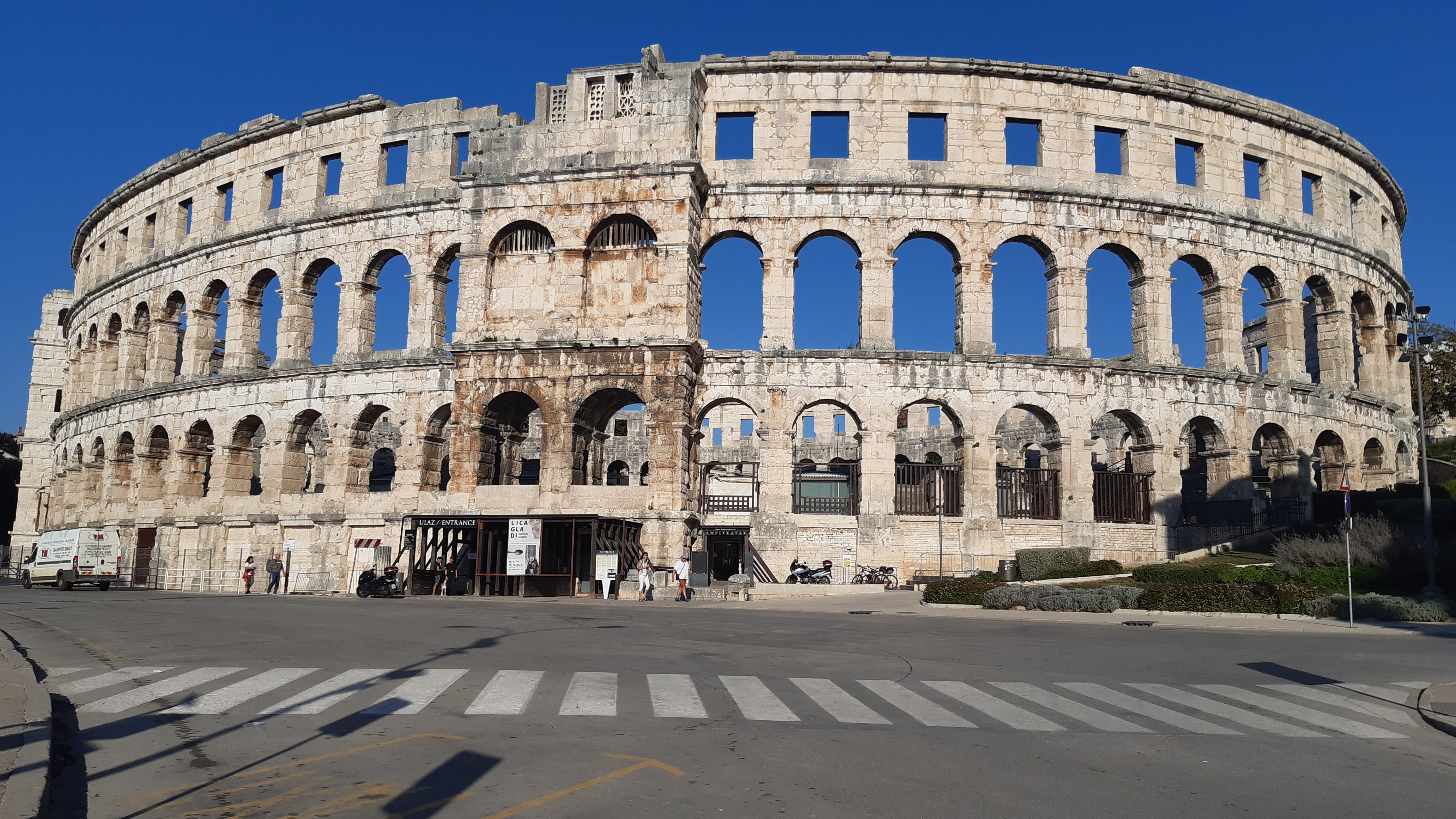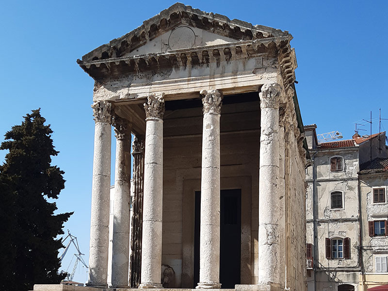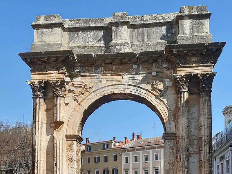 Pula walking tour will take you to the Amphitheater, we will meet there, and the guide will explain from the outside with the view inside. From there we walk to the Venetian Fortress, and enjoy the wonderful view to the harbor and the city. Then we go to Cathedral. Then to Forum with Augustus Temple and City Hall. We proceed to the Roman Mosaic, then to Triumphal Arch of Sergii. Then to Market Building, and remaining's of City Wall, with Hercules Gate and we finish at the Twin Gate.