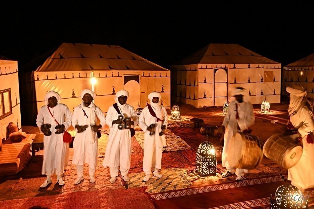 In the morning, continue your journey along the Dades Valley, visiting the impressive Dades Gorge and Todra Gorge, as well as other interesting sites. Arrive at Merzouga, where you’ll have the opportunity to explore the village and meet your camels. Embark on a unique and enjoyable camel ride for approximately 1.5 hours, traversing the dunes to reach our desert camp at Erg Chebbi. Marvel at the stunning sunset over the landscape from the top of the dunes. Upon arrival at the camp, savor a cup of delicious mint tea and spend the evening under the stars, surrounded by the warmth of a fire. Enjoy a traditional meal of Tagine or couscous (vegetarian options available) and engage in a drum party and storytelling. Toilet facilities are available at the camp, and you can choose to sleep under the stars or in enclosed Bivouacs.