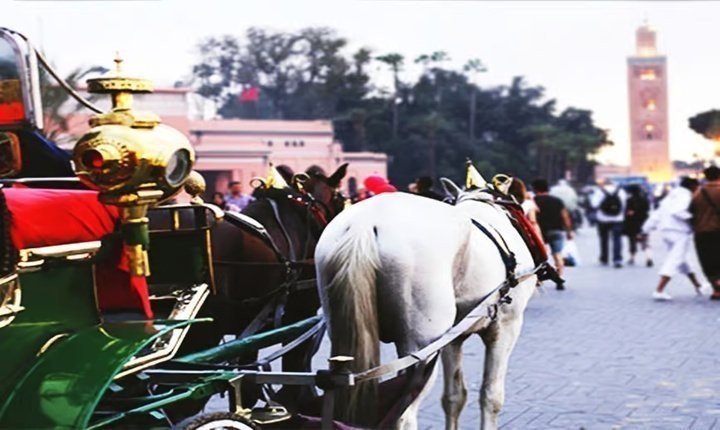 Embark on a Horse-Drawn Carriage Tour in Marrakech and discover the city’s timeless charm. Ride past Jemaa el-Fnaa, Koutoubia Mosque, and the Medina walls, then enjoy a peaceful stop at Menara Garden with stunning Atlas Mountain views. A romantic and scenic escape.