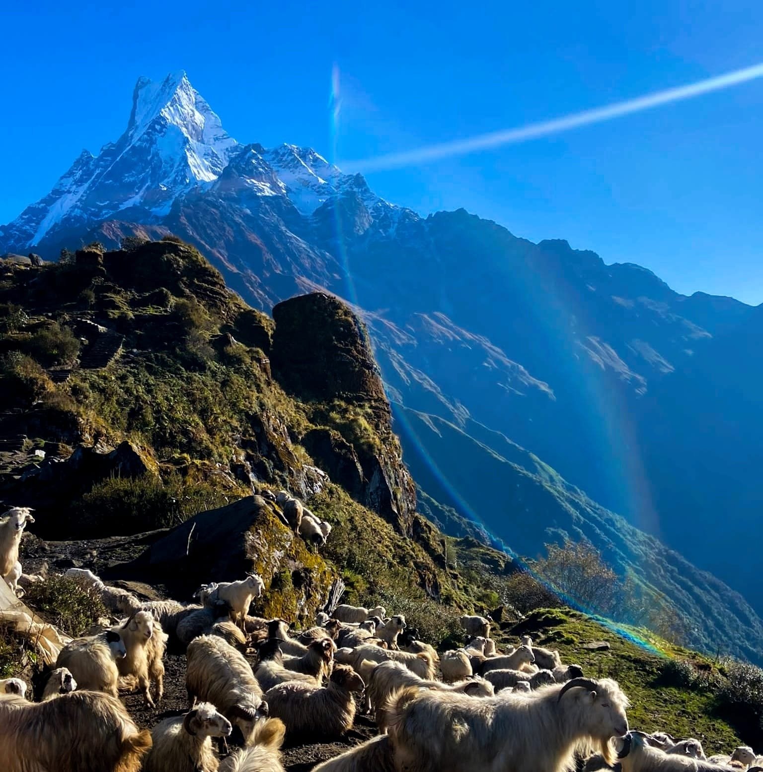 After watching the sunrise at Annapurna Base Camp, you retrace your steps downhill through Machhapuchhre Base Camp and Deurali, descending to Bamboo. The trail is mostly downhill and much faster than the ascent.