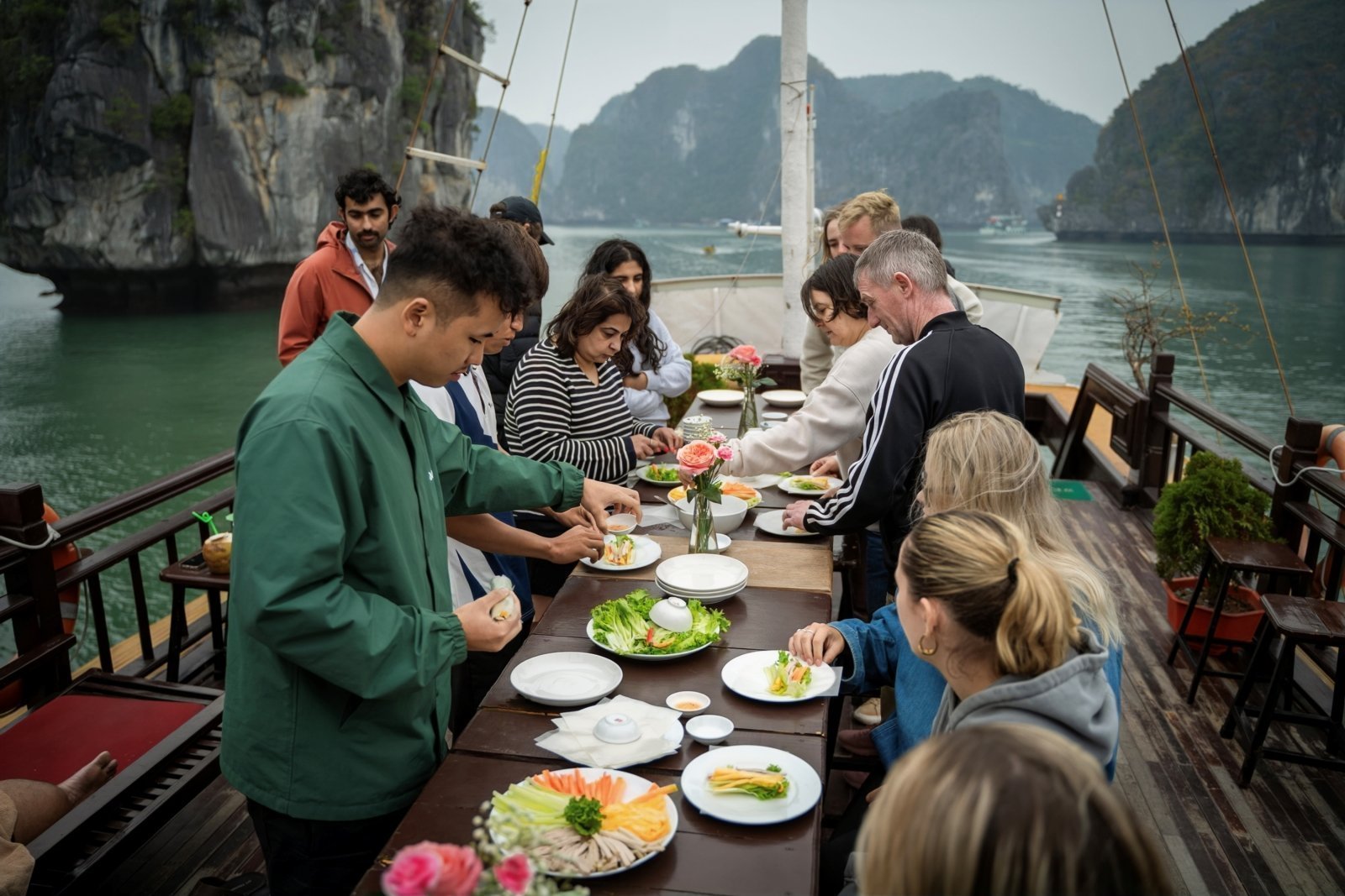 14:30: Swimming and jumping from the boat at Ba Trai Dao Beach which is very natural,remote, quiet and less-touristy. We can discover the temple beach, more lagoons and arches. 15:00: After swimming, we will visit a local fish farm where you will see how localfishermen live on the water and how they farm the fish. In the meantime, join us for acooking class – an exciting activity to experience some of Vietnam's most enticing traditionaldishes.