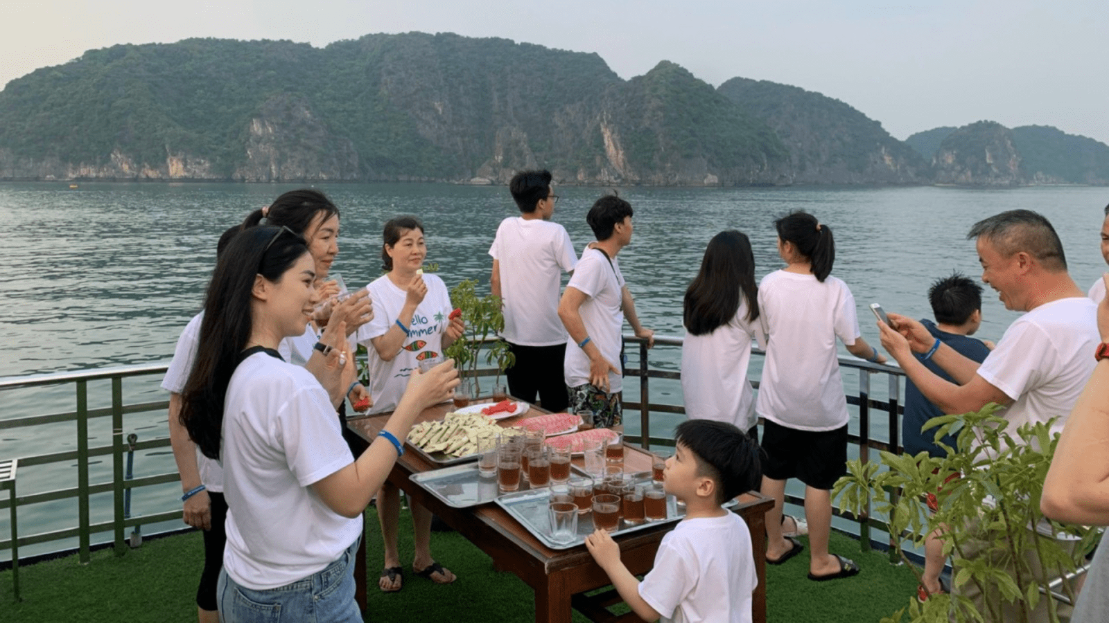 As the cruise returns toward Tuan Chau Harbour, relax on the sundeck with a refined sunset party featuring fresh fruits, snacks, and drinks while admiring the golden light over the limestone karsts.